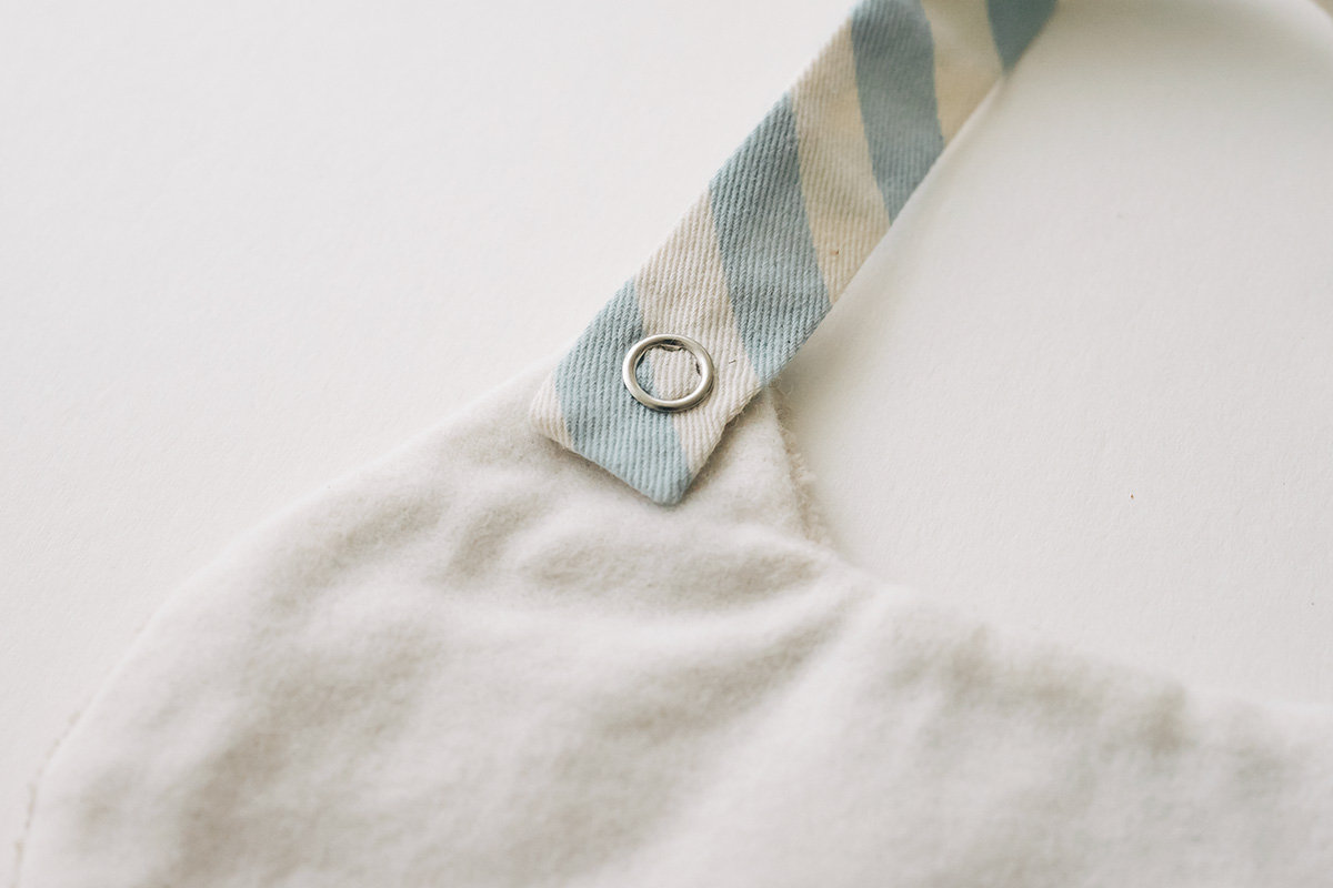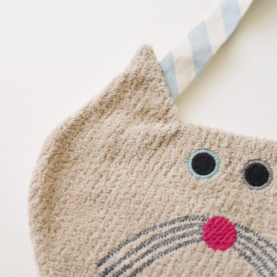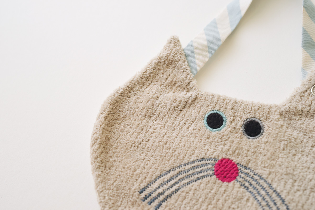 掛著可愛鬍鬚的貓圍兜,表面使用觸感柔順的棉絨織物,目鼻經過毛氈和刺繡修飾,內襯是柔軟的棉絨布,圍兜一側有四合扣,即使寶寶躺在床上也