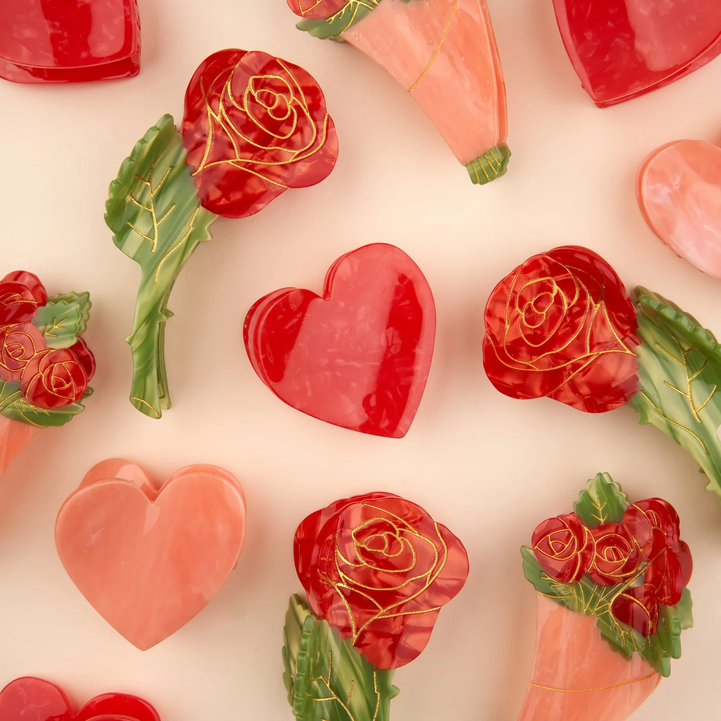 這款髮爪夾以剛採下的玫瑰為造型,細緻呈現花刺與深紅色花瓣,宛如一枚小巧的珠寶,點綴在任何髮型上都格外亮眼。