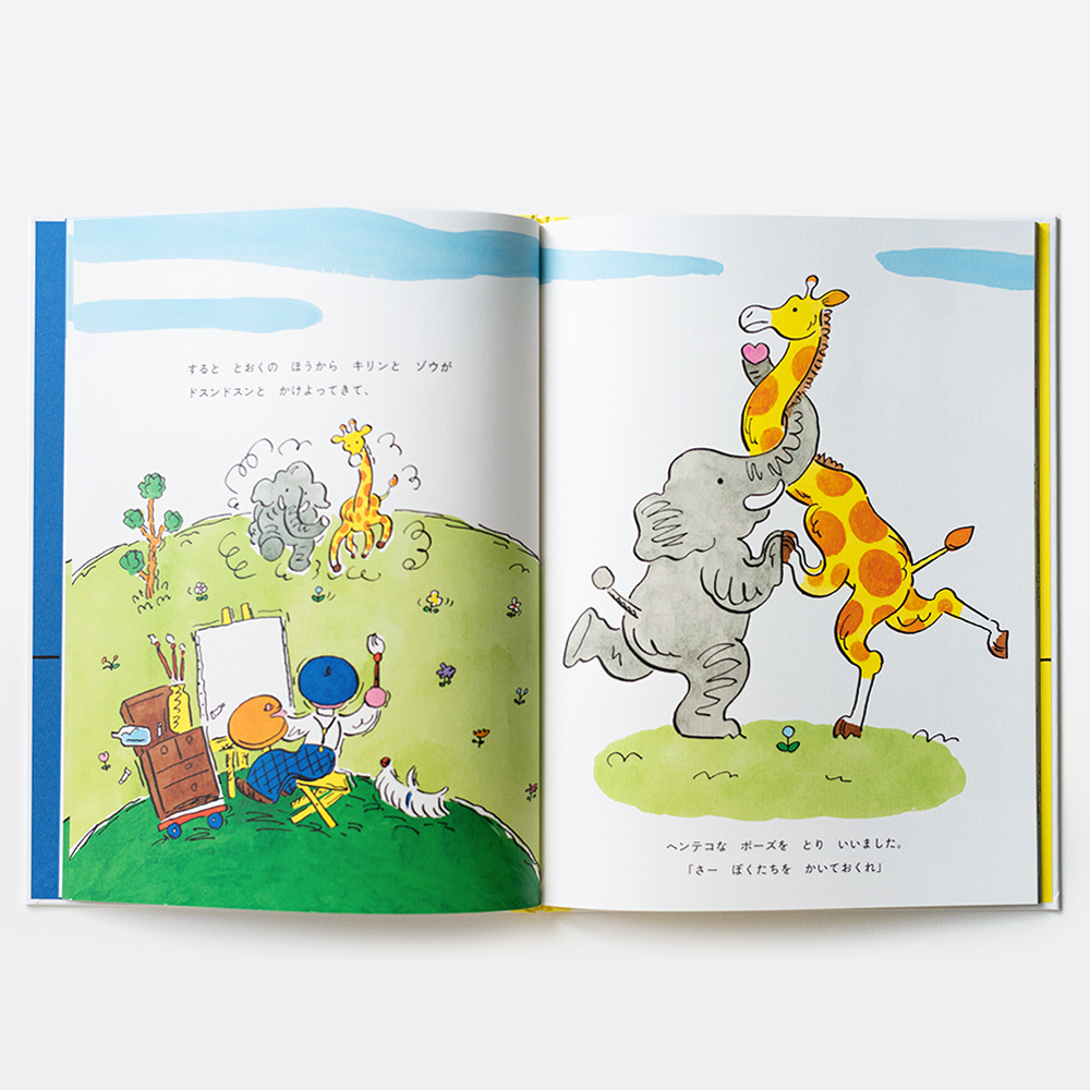 「咚咚咚」,從遠處跑來了一隻長頸鹿和一頭大象,牠們擺出奇怪的姿勢並要求畫伯為他們畫畫。接著,土壤中的鼴鼠和土撥鼠紛紛冒出頭來,也請求畫伯畫他們。連四周的樹木、雲朵和河流也紛紛加入,每個角色都不甘示弱,拼命爭著讓畫伯畫自己。甚至還出現了噴發的火山和照亮大地的太陽。這場景究竟會演變到什麼地步呢…?