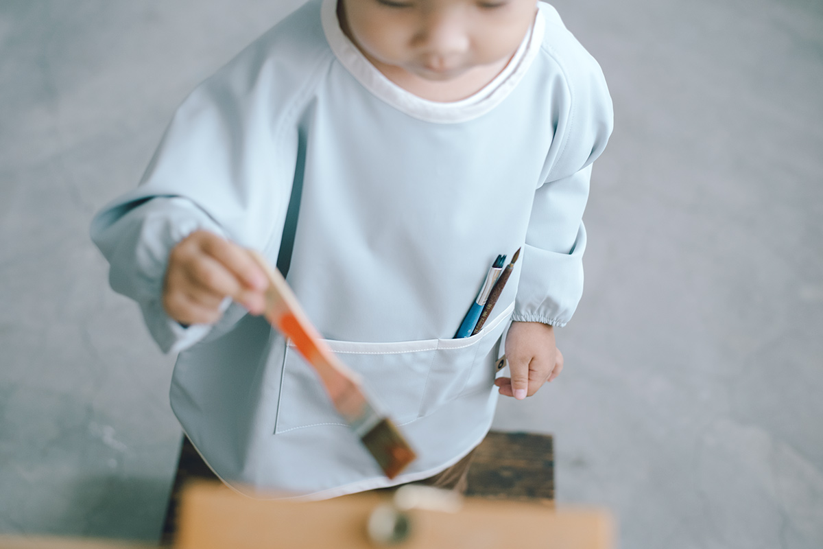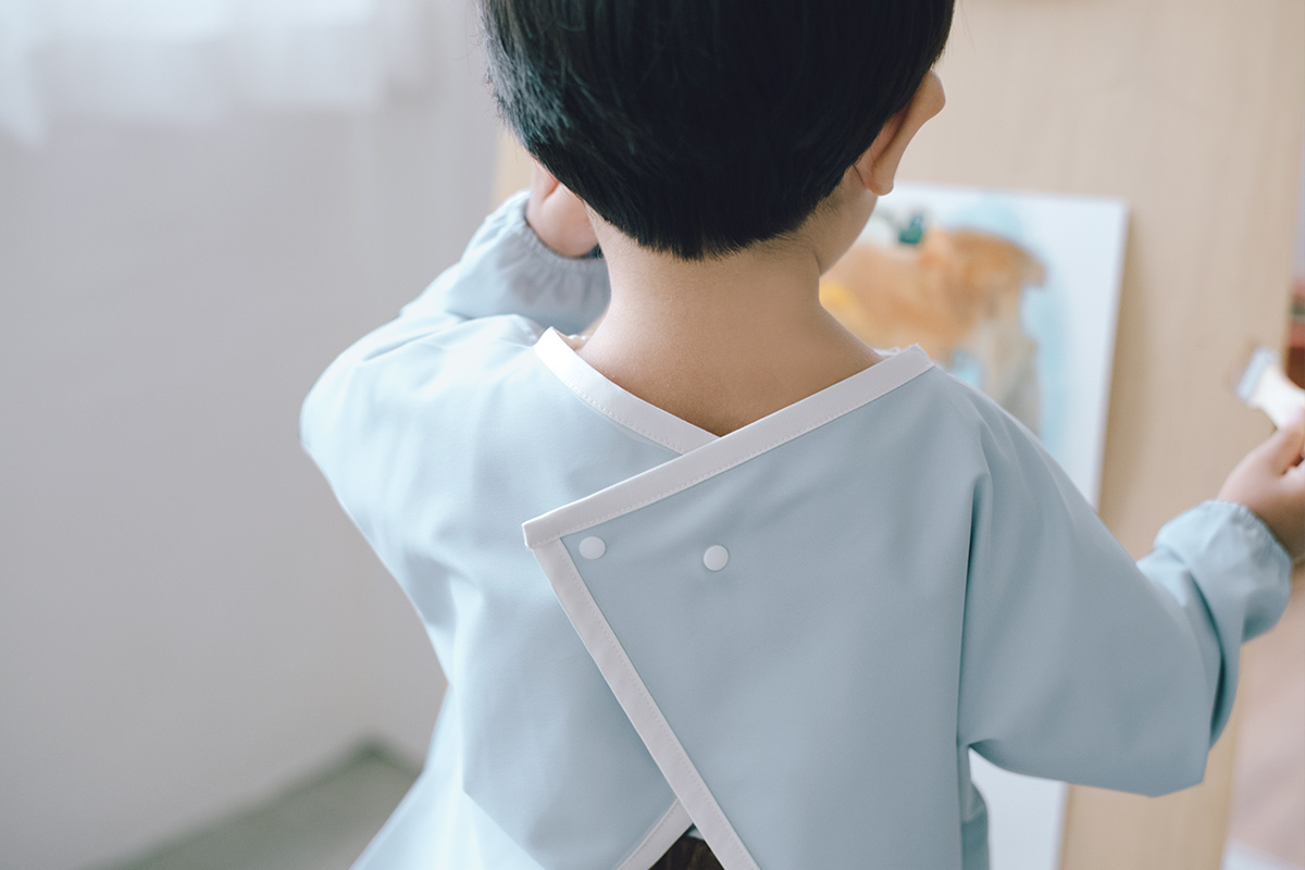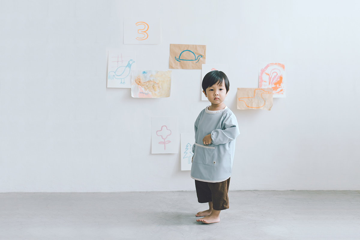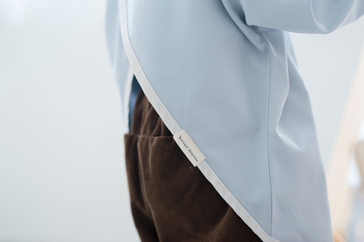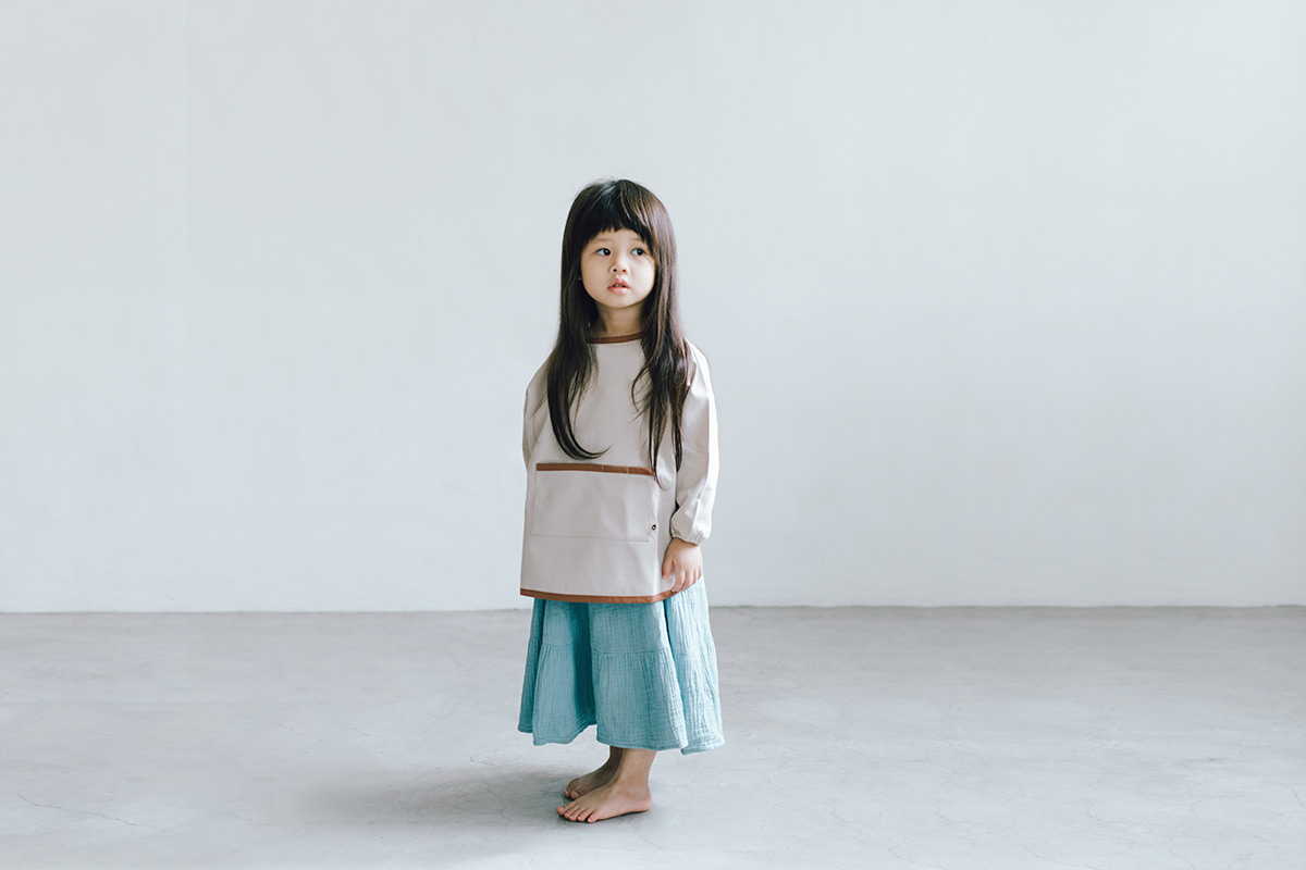 和 18 世紀歐洲畫家一樣,為防止因工作弄髒自己的衣服而穿上罩衫,孩子也需要有著保護力十足又舒適的工藝服,擋下顏料、黏土、食物等髒污。kanan muna 找尋到不同以往質地的斜紋織品,柔順透氣、防潑水且抗皺,顏色溫和,適合各種下著搭配。有三種顏色可選擇 grey blue、beige、pink