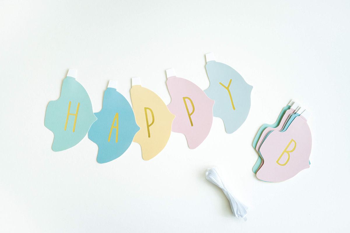 帶有單詞「HAPPY BIRTHDAY」的吊飾,字母是以金箔處理,並附上 2 條緞帶,重量輕可直接以白色紙膠帶黏貼於牆上固定裝飾。
