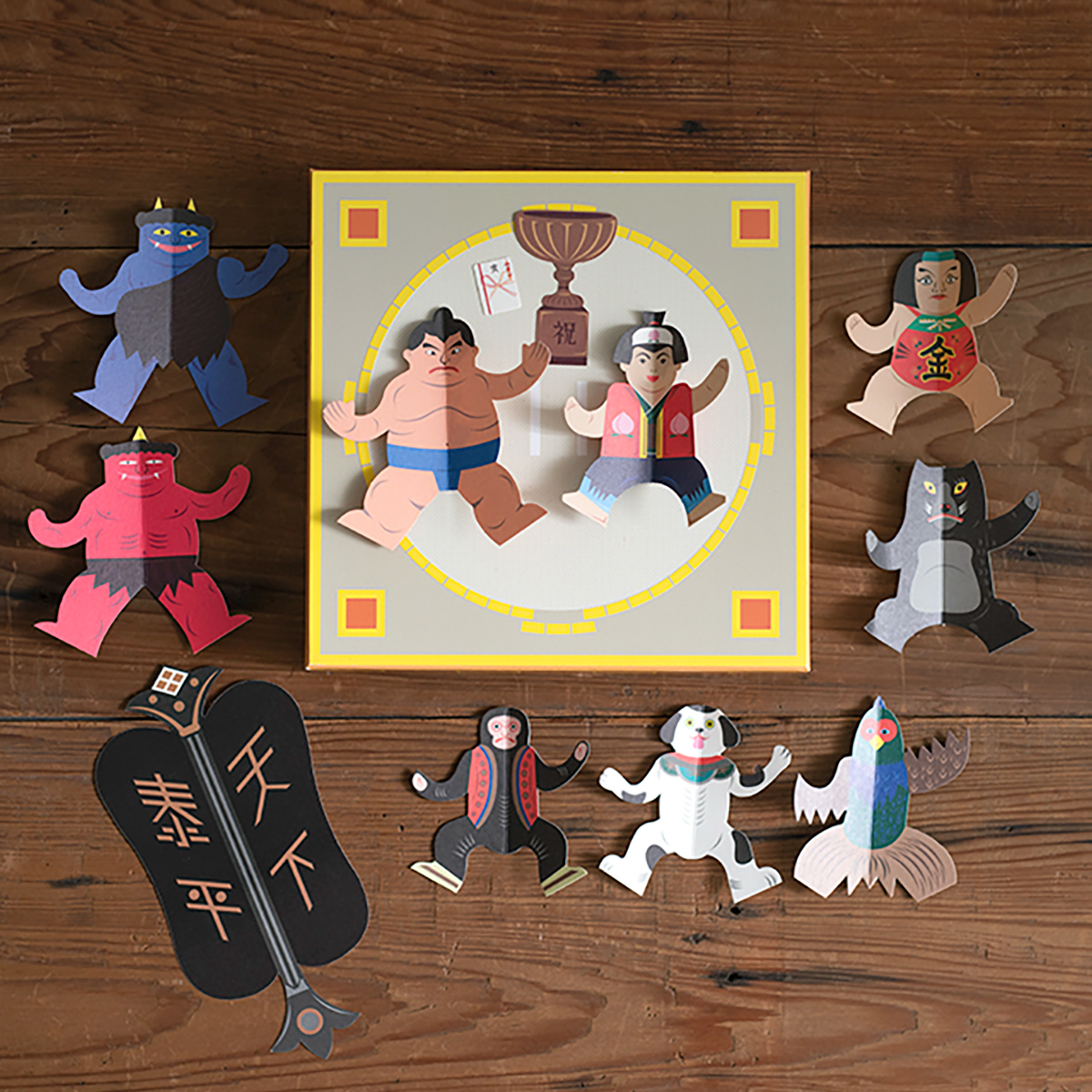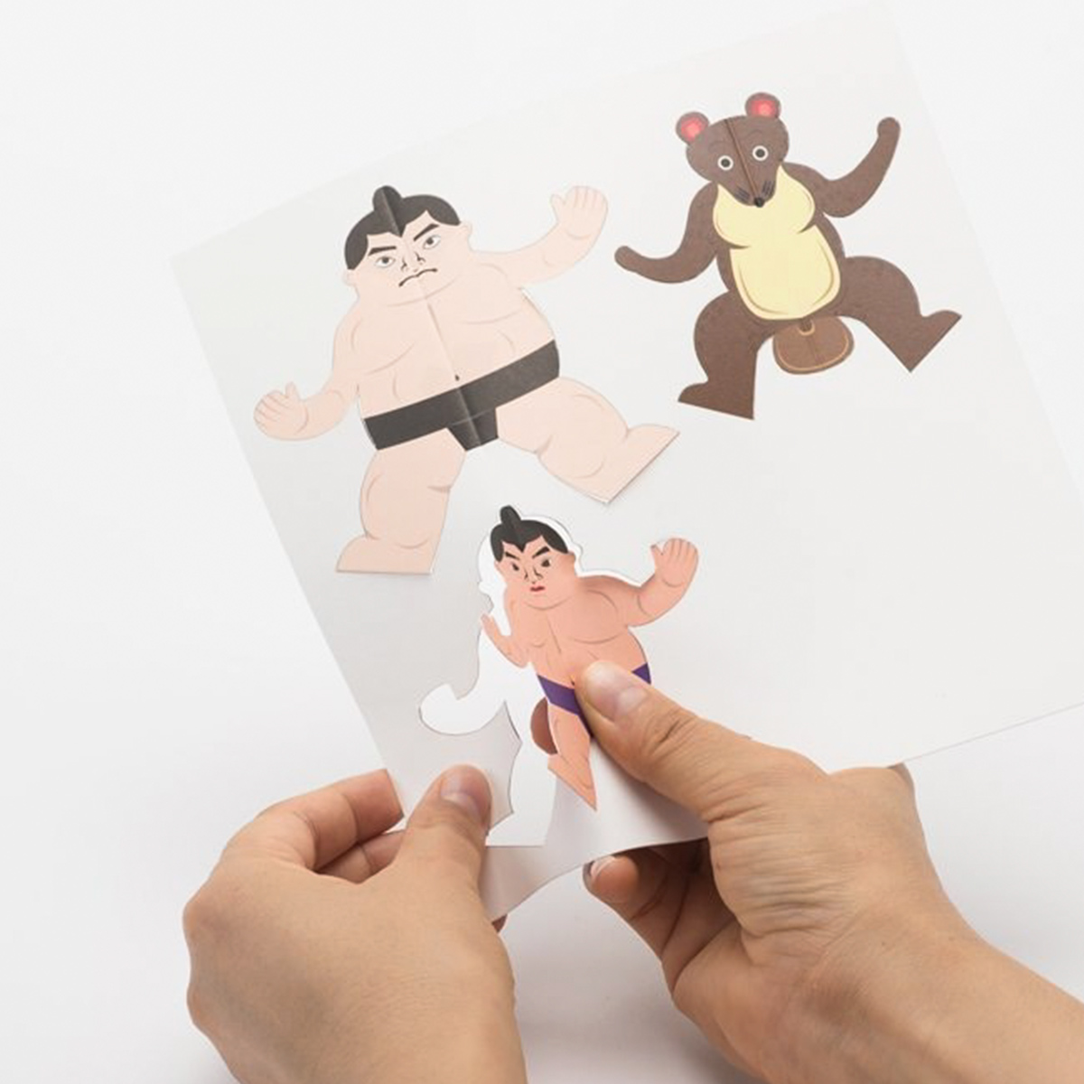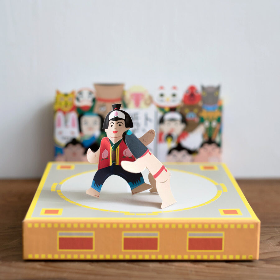 將書中的紙片裁切下,作成相撲力士放在紙盒上,每款力士因體型的不同而有不同力量,適合大人小孩一起玩的桌上遊戲。