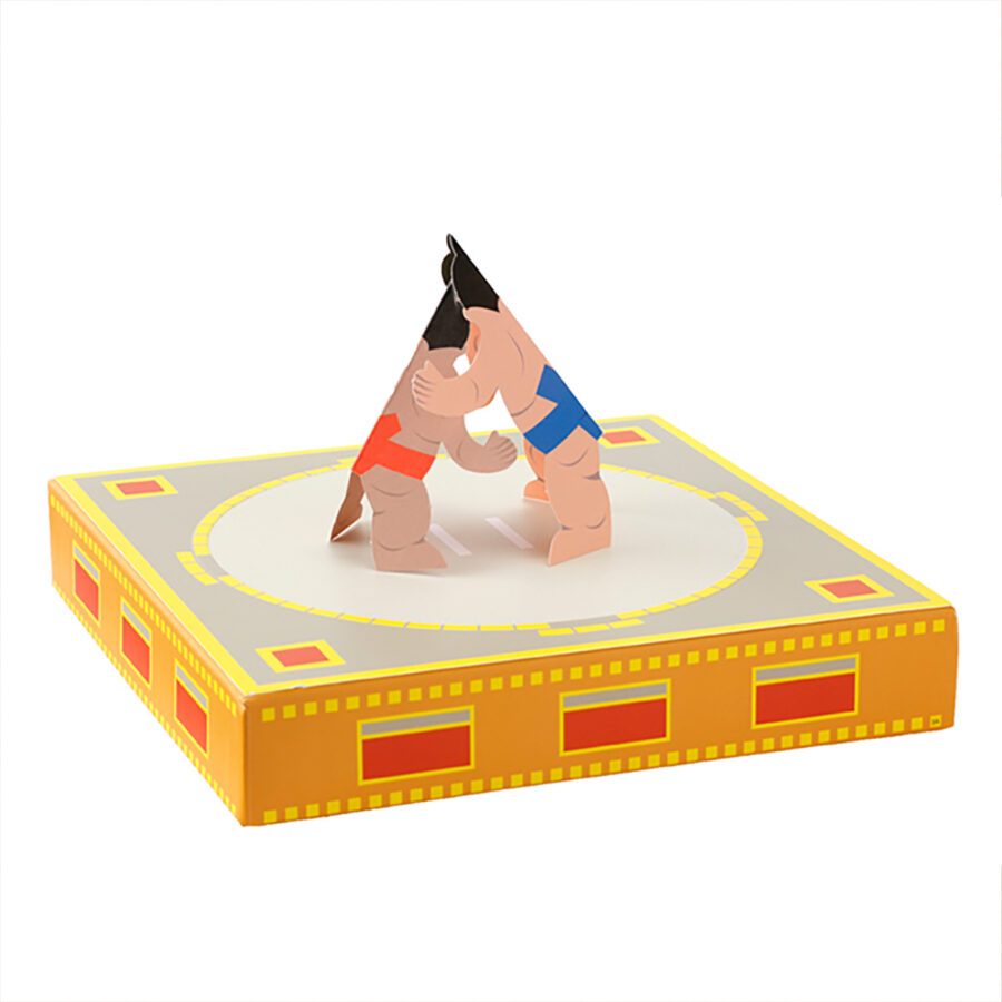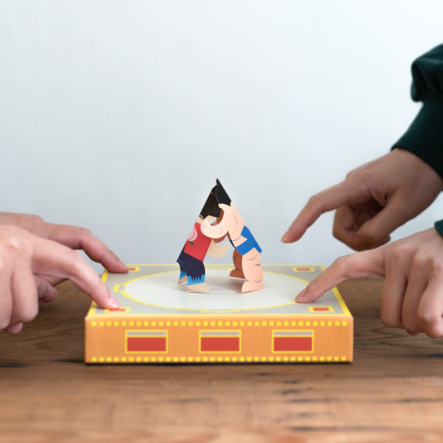 將紙人的相撲力士放在紙台上,咚咚地用手指敲擊紙盒邊緣,以振動讓相撲力士移動比賽較勁,誰先倒下誰就輸!