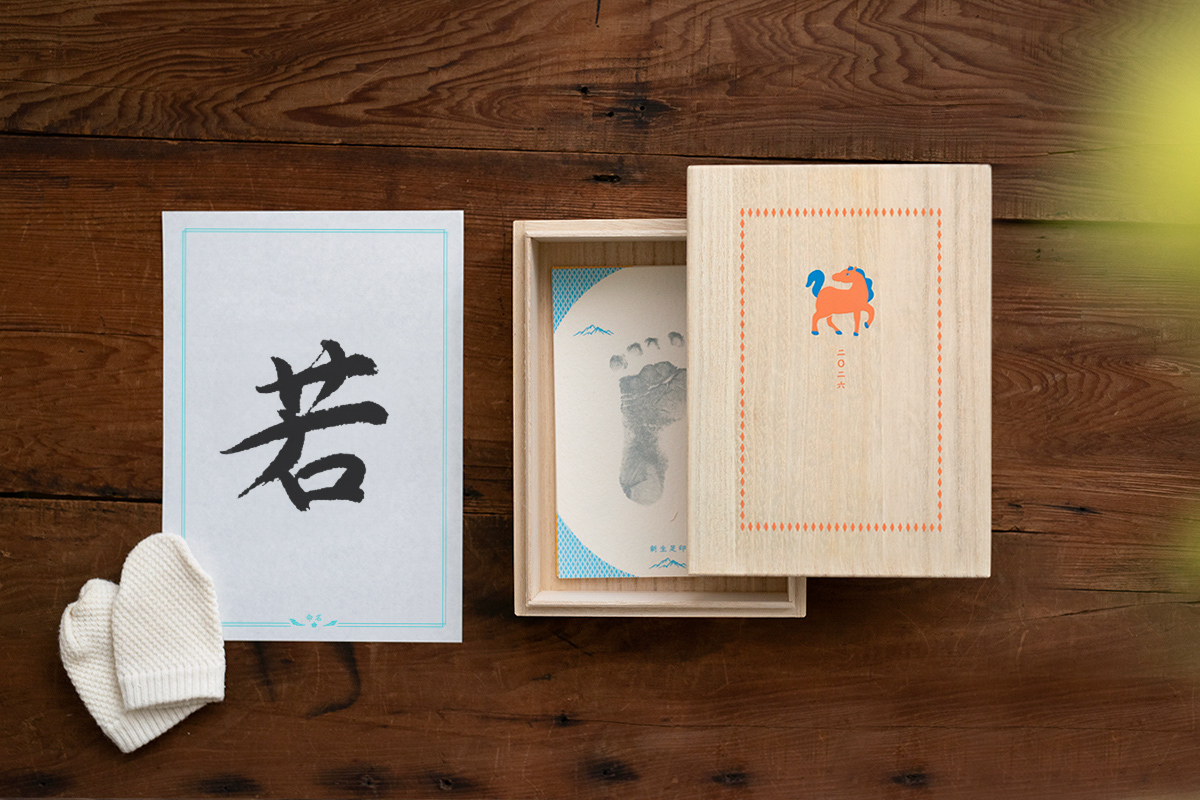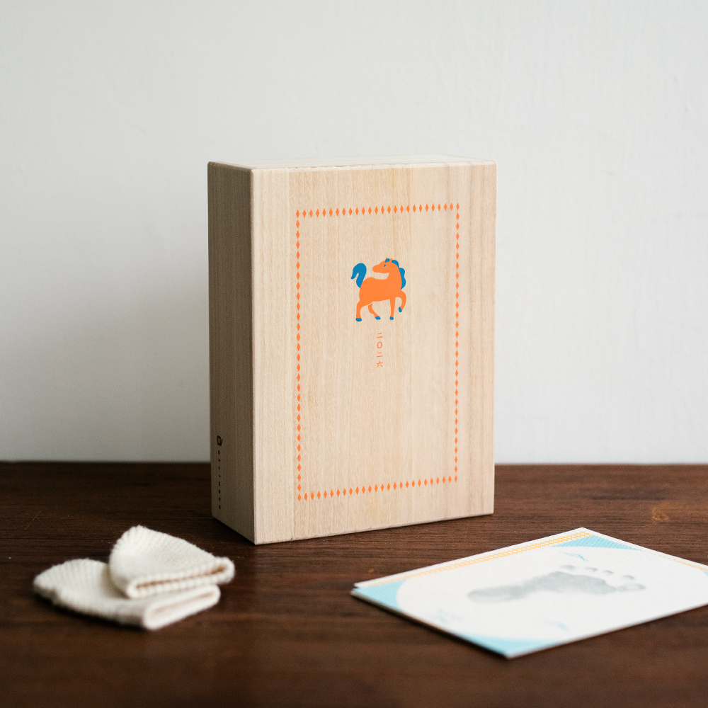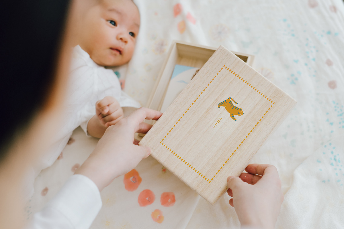 用桐木盒將寶寶珍貴的新生足印、手印、第一張相片、以及為寶寶的命名紀念收藏起來。