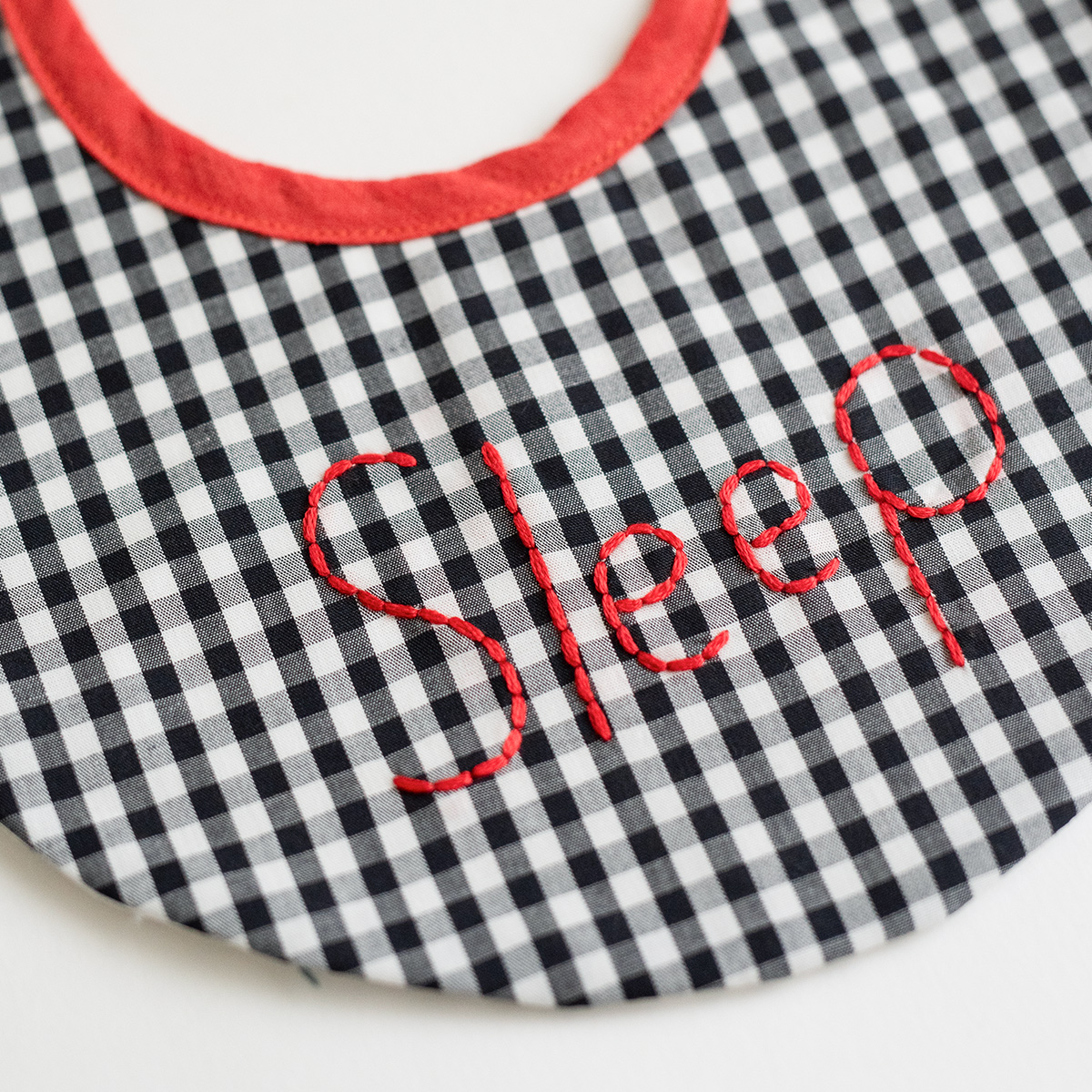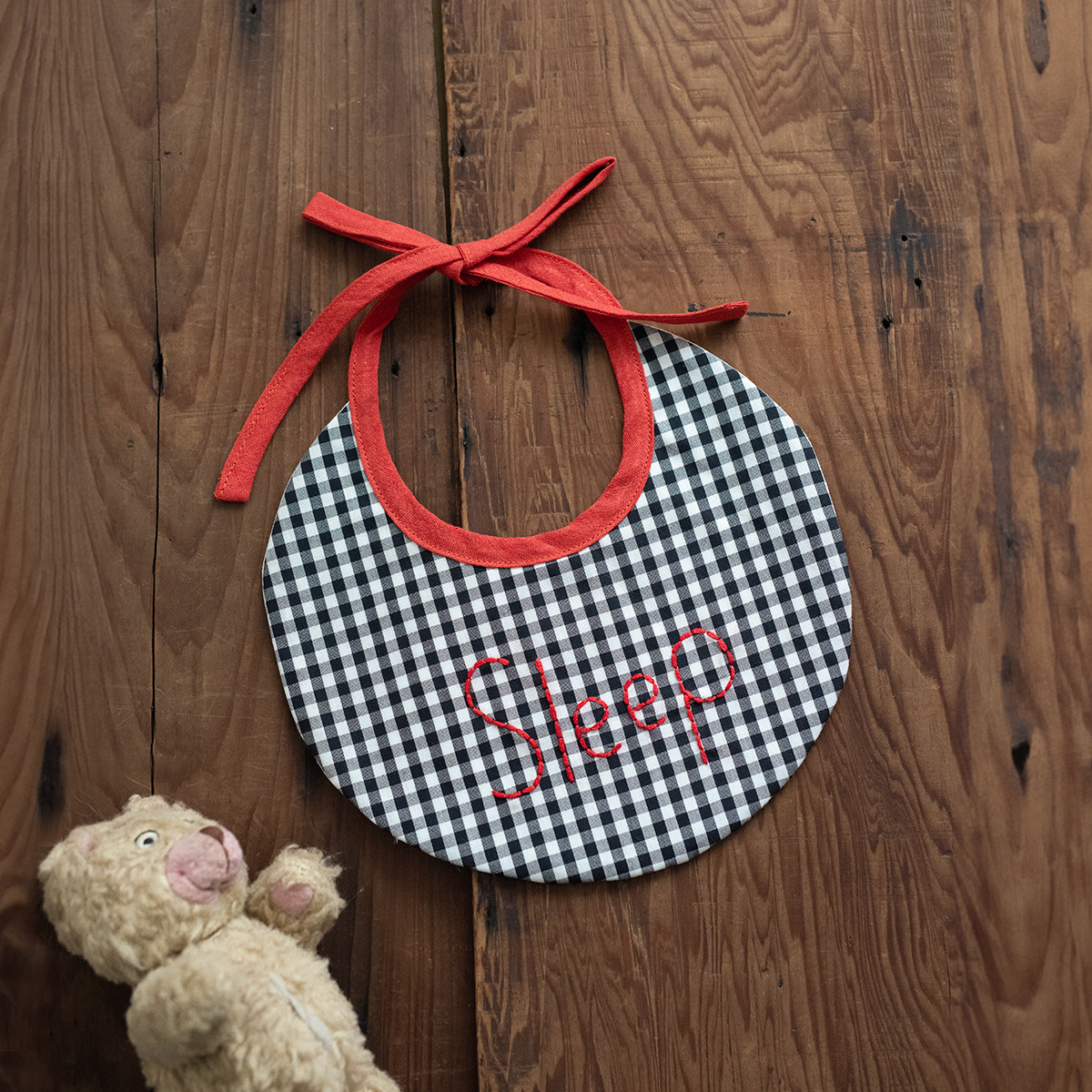 嬰兒圍兜以細緻的千鳥格紋搭配刺繡,在黑色格紋布上,以紅線繡上 Sleep 字樣,讓人忍不住會心一笑。