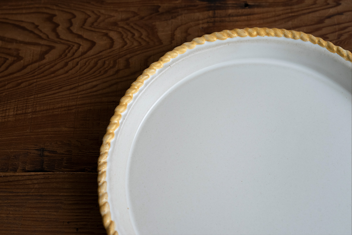圓盤低調華麗的金色邊框、角盤的斜紋邊框,與菜餚相得益彰。