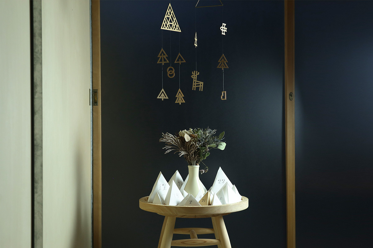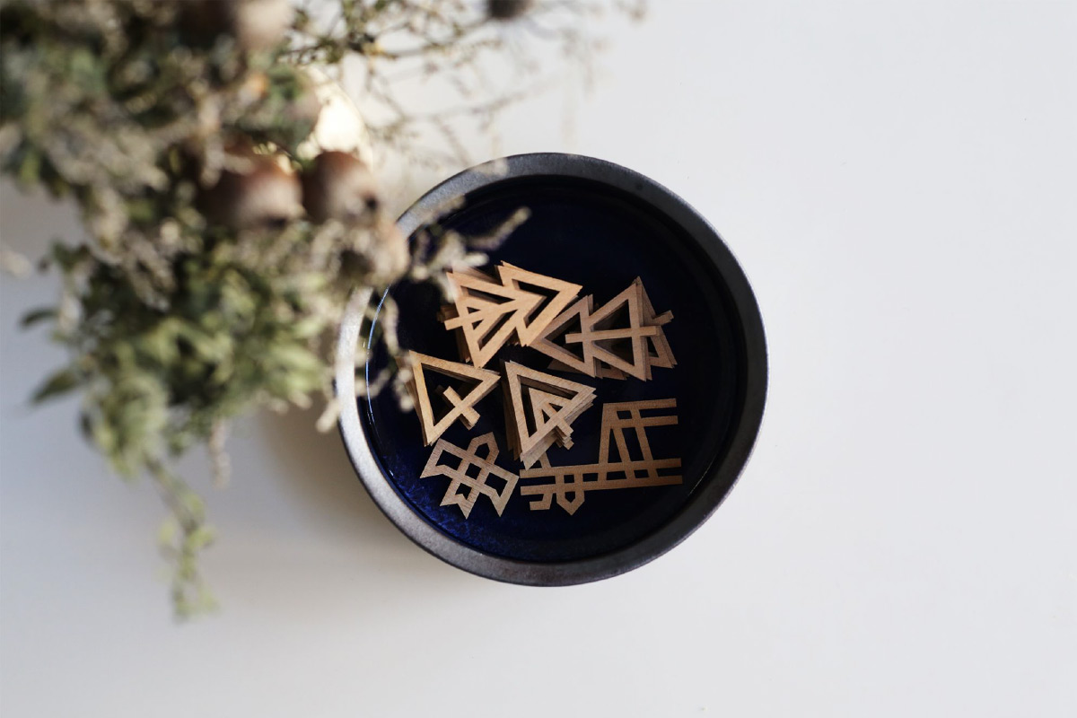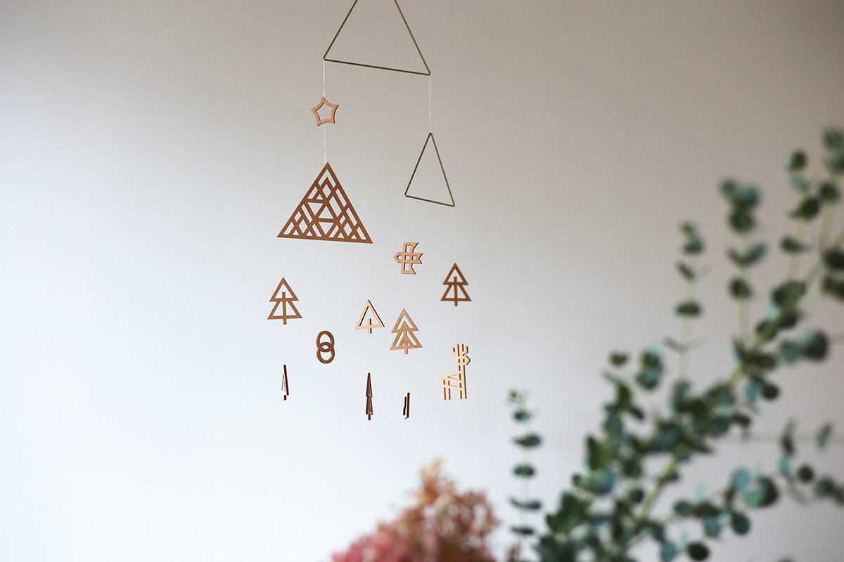 以「森林」作為啟發,在黃銅製的兩座大山下,Sukima 將鹿與鳥、樹木與山脈放進了木造吊飾中。