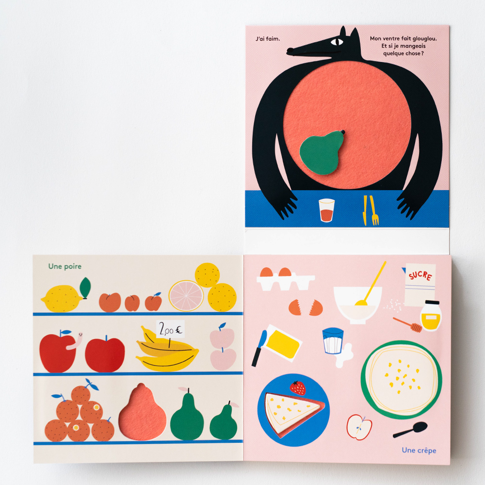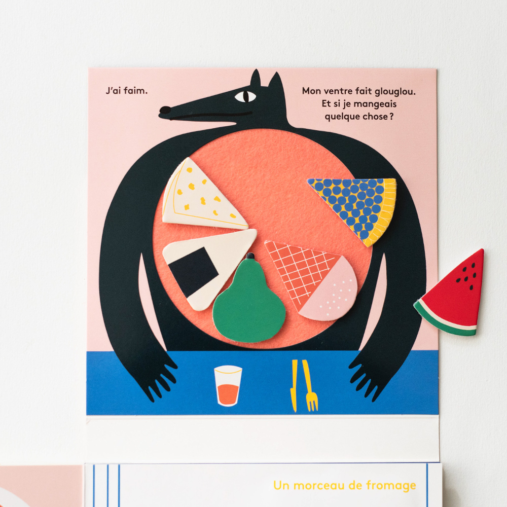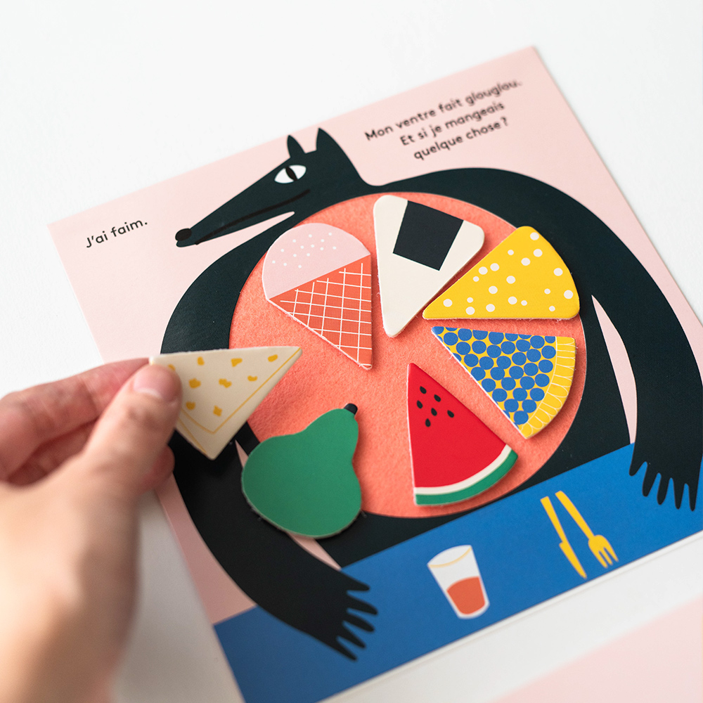 每一頁,小朋友可以將這些「食物」放進狼的肚子裡,幫助狼填飽肚子。隨著故事進展,狼的肚子越來越滿,裝滿了各種美味。好了,大野狼不再飢餓了…我們解除了小紅帽、三隻小豬的危機!