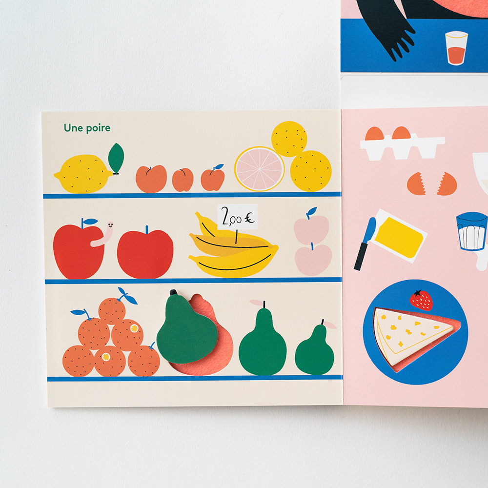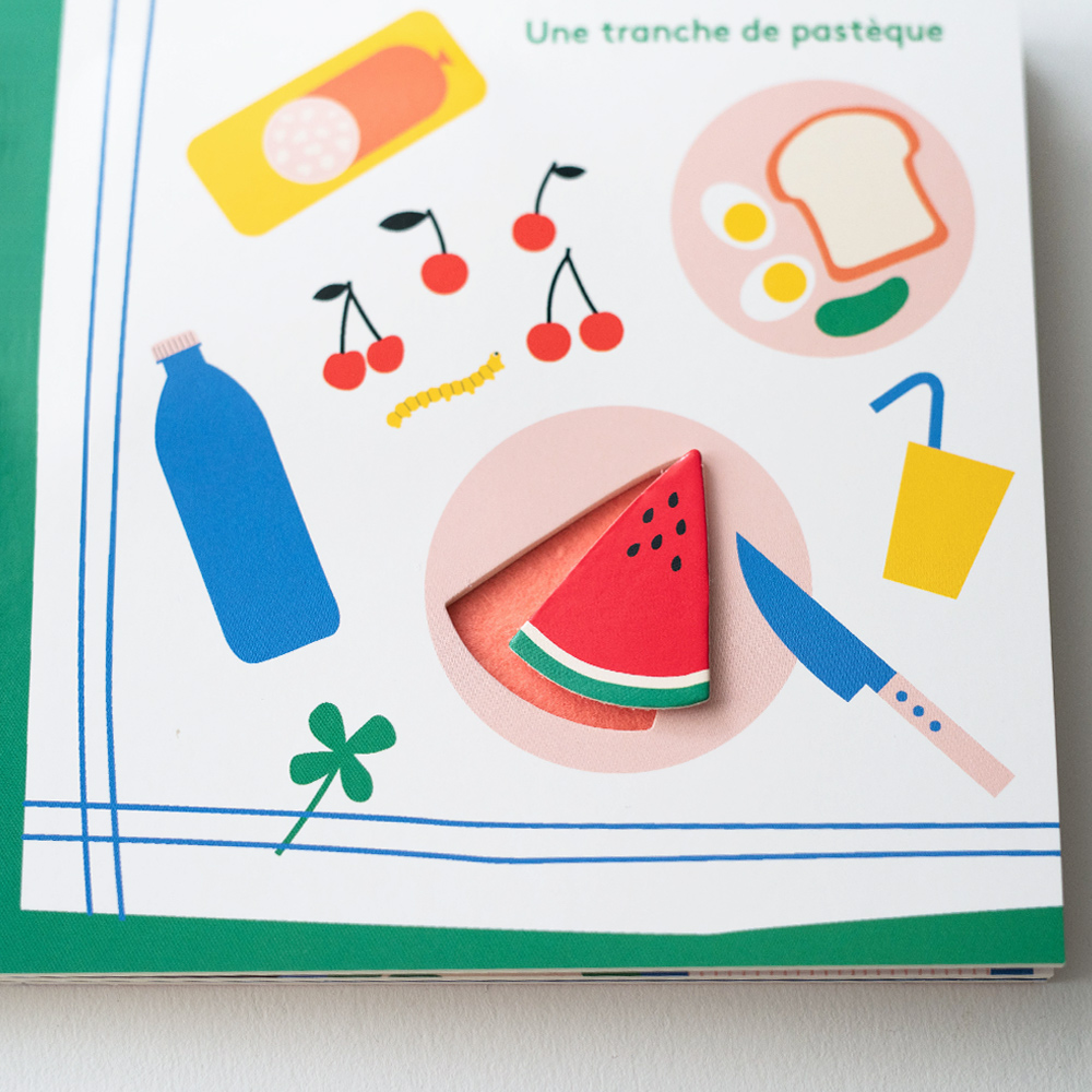 在廚房的料理台上,他發現了一顆大蘑菇。在野餐的桌布上,有一片西瓜。在冰箱裡,有一塊瑞士起司。在咖啡館的桌子上,有一片藍莓派…